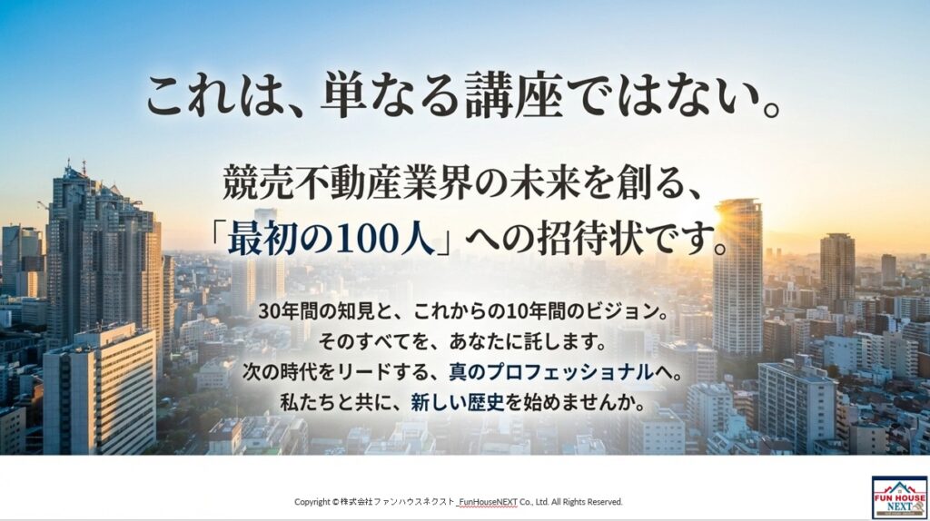 「まる投げ競売不動産®」競売不動産コンサルタント養成講座 2025-12-13 最終更新日時 : 2025-12-13 FunHouseNEXT ついに本格スタートします! ゼロ期生につき12月中にお申込みに限り特典がございます! お問い合わせお待ちしております!